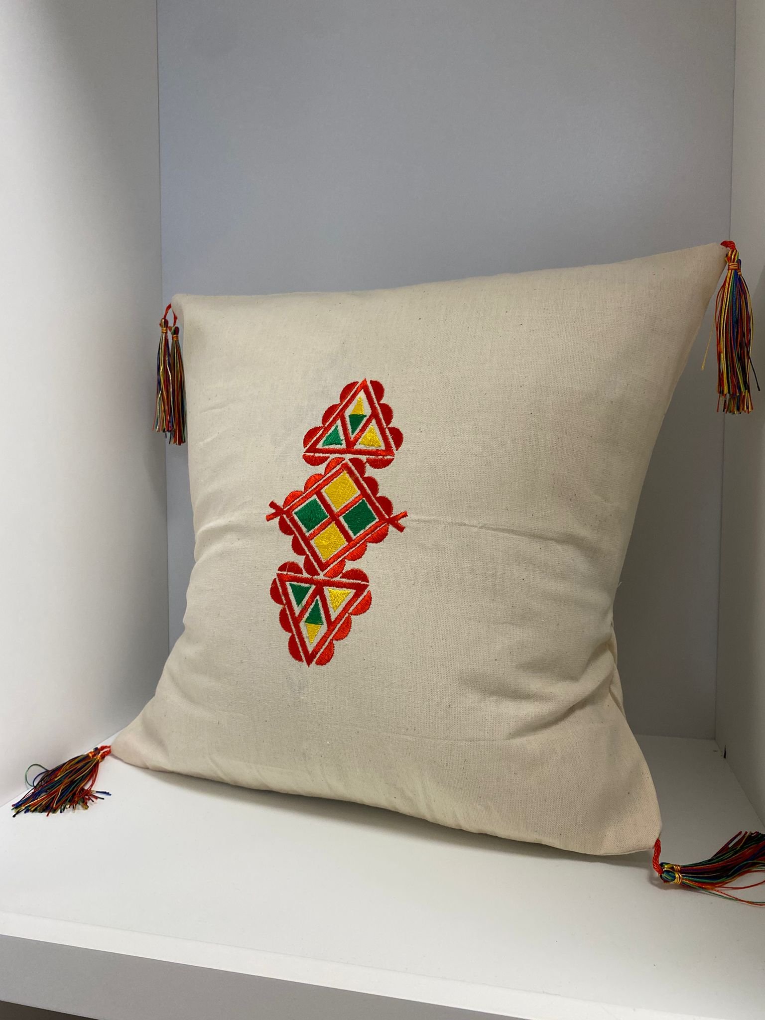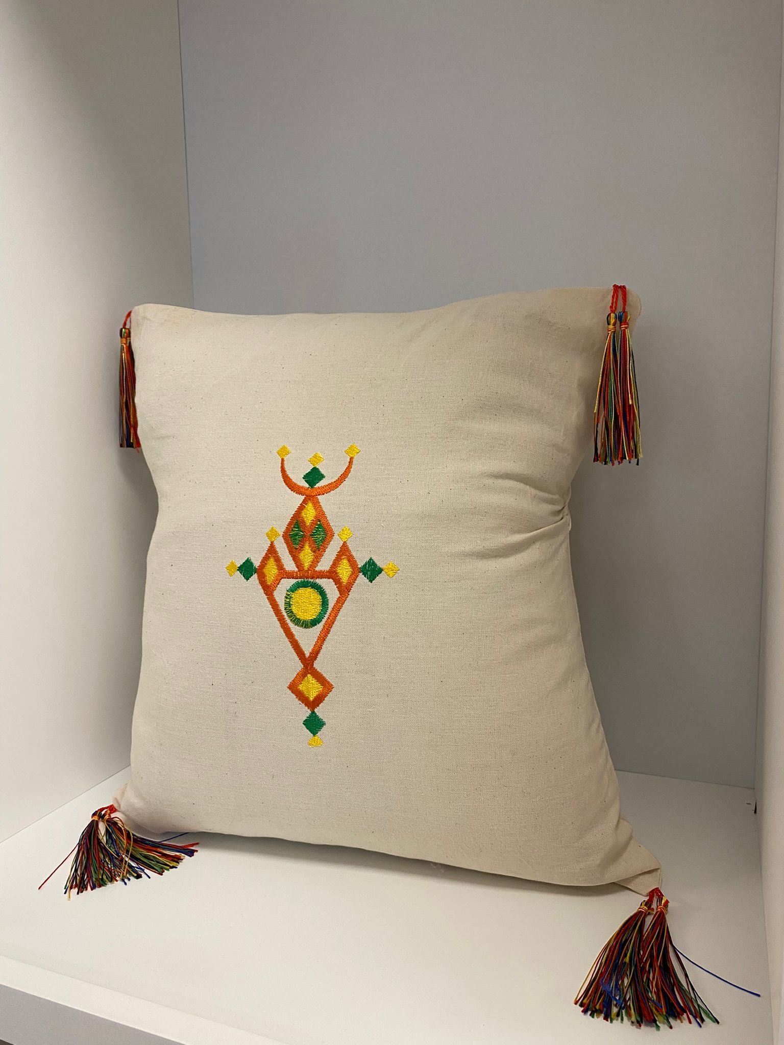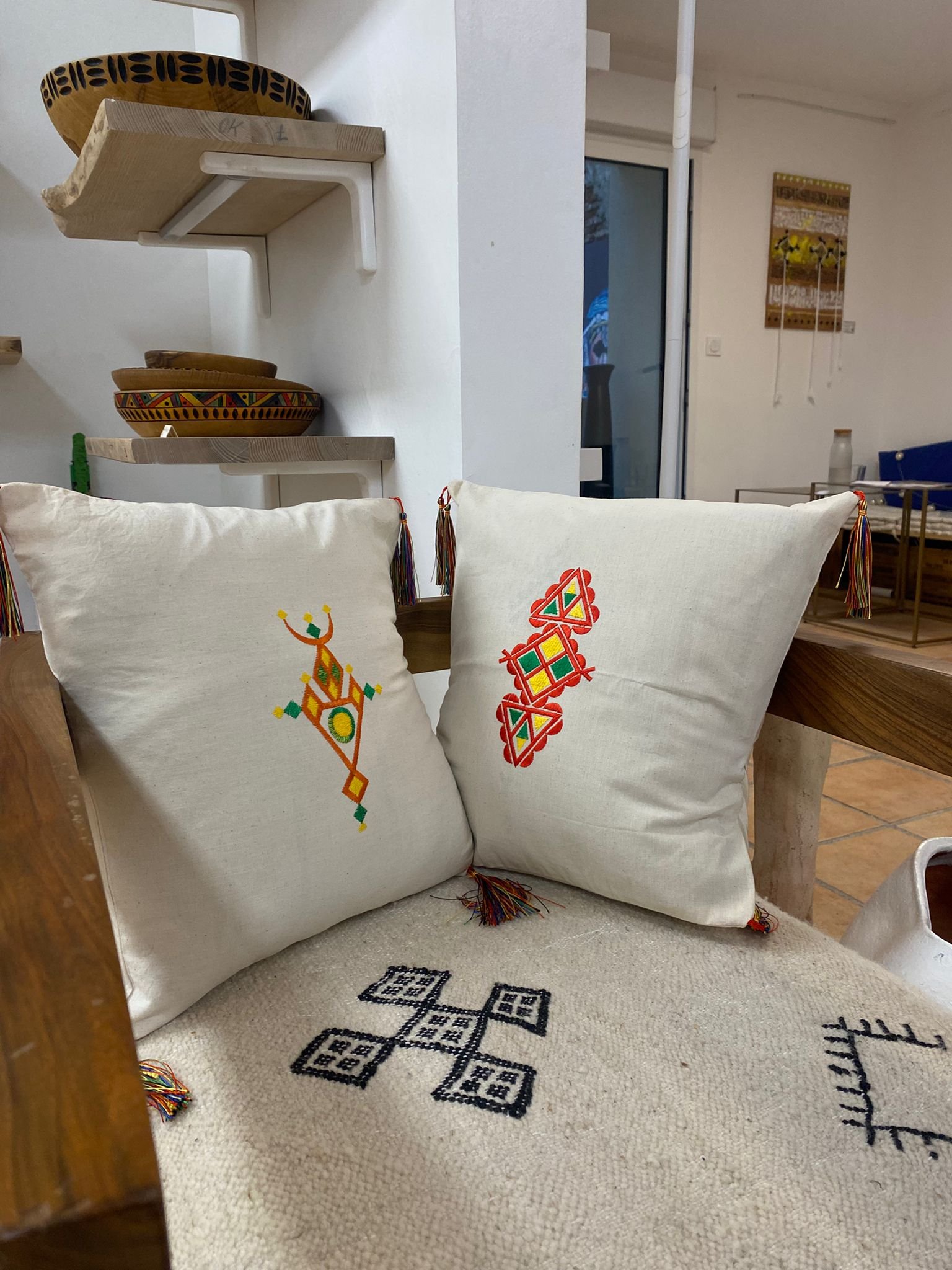 Houria slimani est une tisserande algérienne, qui brode des housse de coussins en lin, allant de la thématique algérienne, amazigh etc…