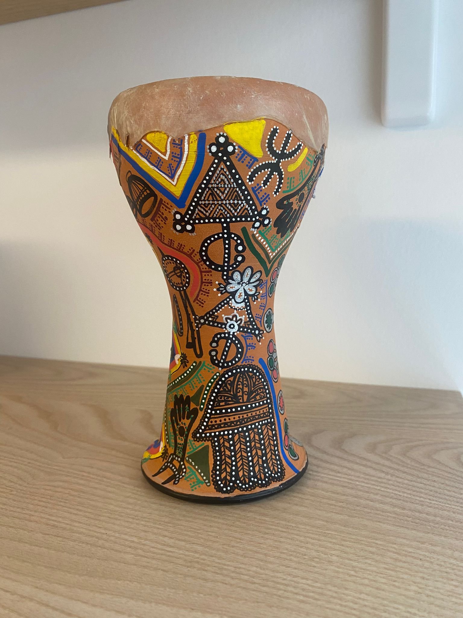 instrument de percussion et symbole de festivités folkloriques au Maroc, les dessins symbolisent des objets d’artisanat féminins surtout, notamment des bijoux et des broderies, de la region de Souss au Maroc.