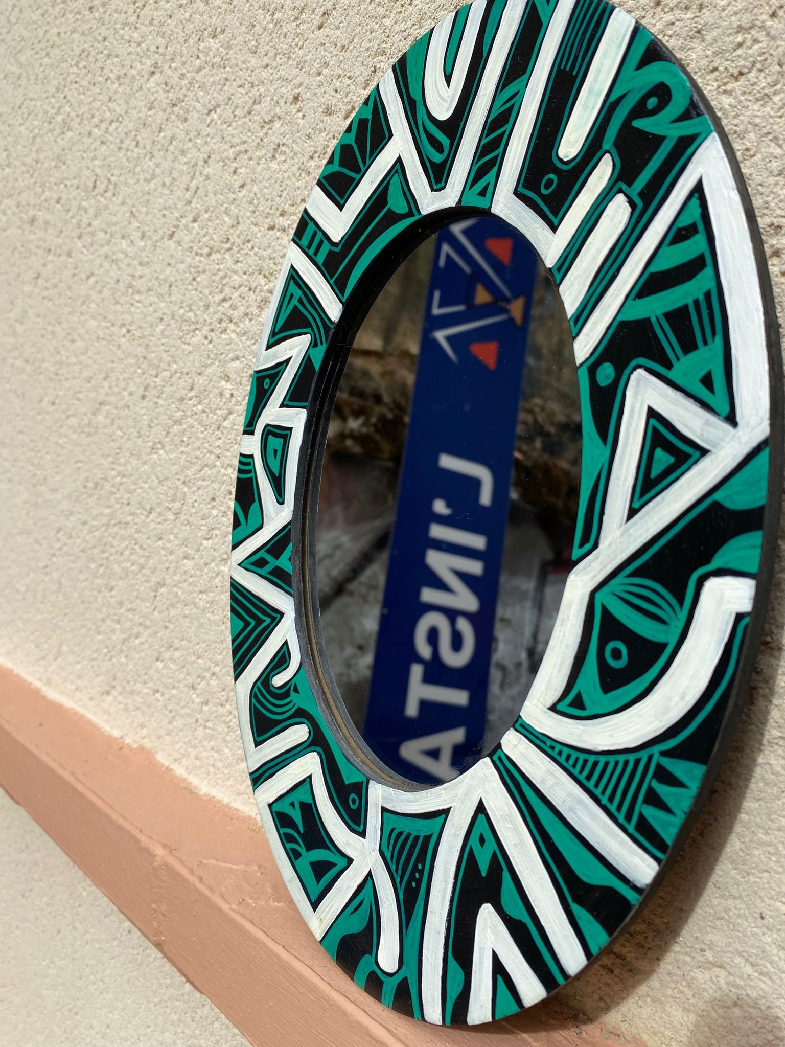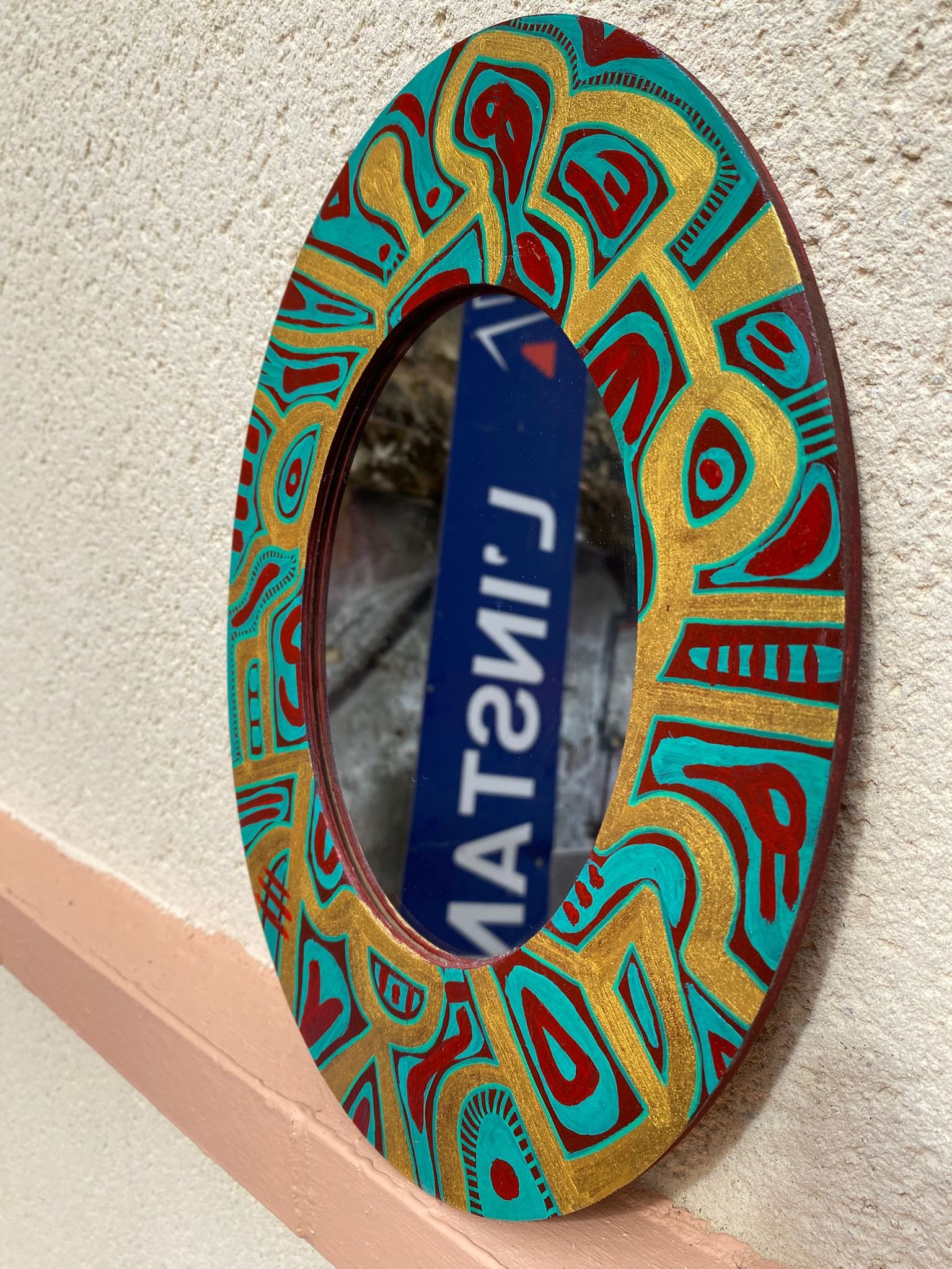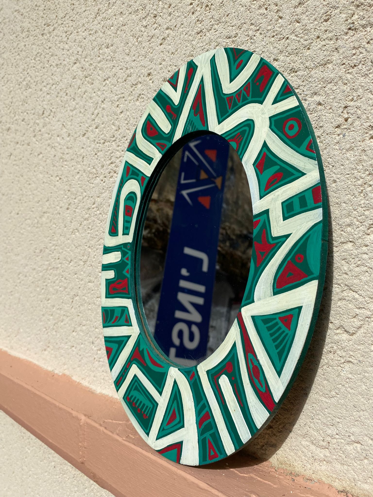 Les miroirs en bois de Yeddina sont des pièces uniques, fabriquées à la main en Algérie, et décorées avec des symboles amazighs riches de sens. Sculptés dans du bois travaillé artisanalement, ces miroirs sont peints avec soin dans un style vibrant et coloré, propre à l’esthétique berbère contemporaine.