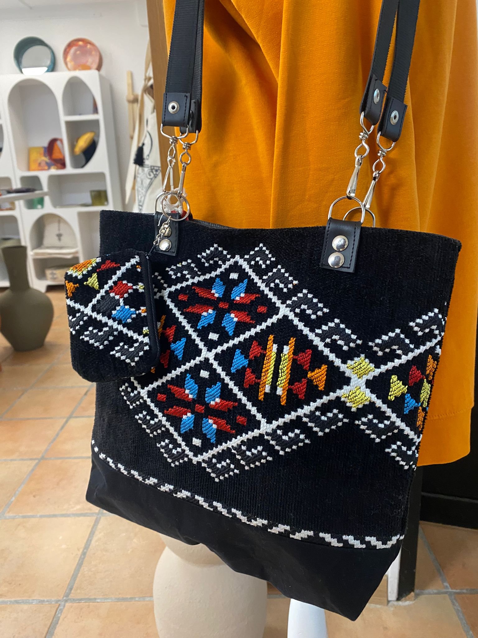 Optez pour l’élégance et la praticité avec notre sac à main bandoulière en tissu brodé de motifs amazighs, cousu à la main et livré avec une pochette assortie.