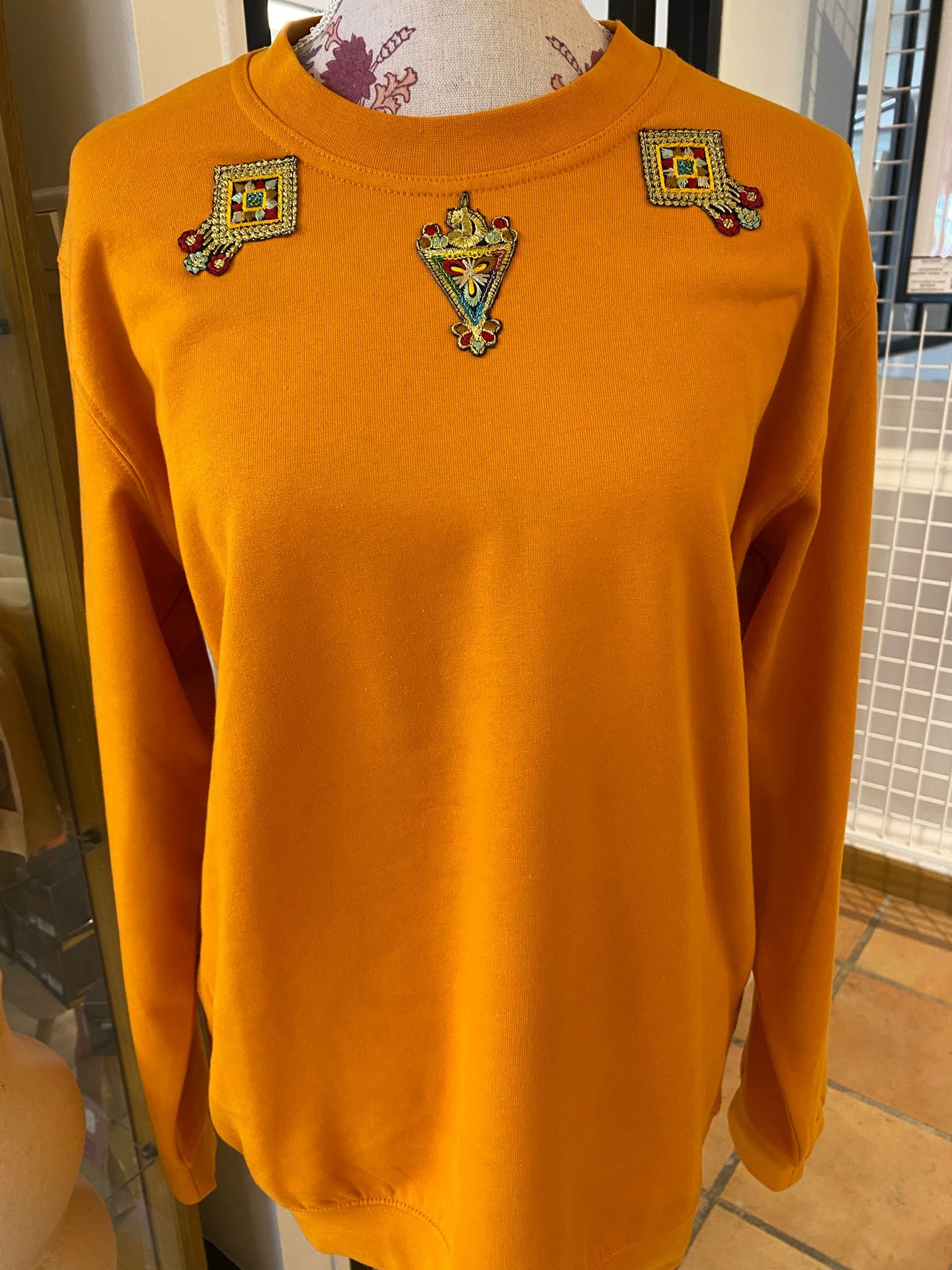 Ce pull d’un orange chaleureux et lumineux, rend hommage à la culture amazighe à travers ses fibules traditionnelles finement brodées. Symbole de protection et de féminité, la fibule berbère s’invite ici comme un bijou textile, entre modernité et héritage ancestral.